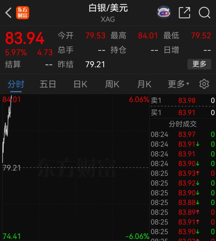 现货白银日内涨幅扩大至5.97%,报83.94美元/盎司。
